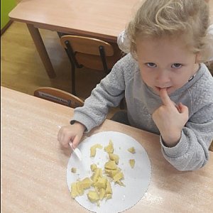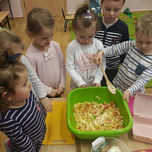Najmłodsza grupa "Krasnoludki" zrobiła sałatkę jarzynową. W grupie "Biedronki" i "Motylki" z owoców powstały przepyszne smoothie oraz sałatka owocowa. Podczas warsztatów kulinarnych przedszkolaki miały okazję poznać wygląd, smak i zapach niektórych warzyw i owoców. Utrwalały zasady bezpiecznego posługiwania się kuchennymi sprzętami gospodarstwa domowego.
