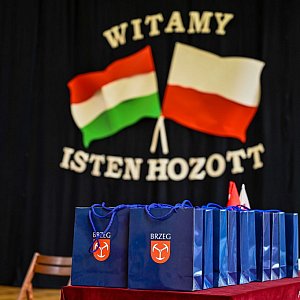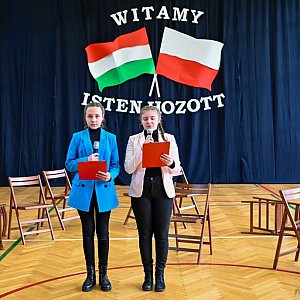 Węgiersko - polskie spotkanie rozpoczęło się od krótkiego programu artystycznego przygotowanego przez uczniów naszej szkoły pod opieką nauczycieli. Uwagę przybyłych bez wątpienia od razu przykuły flagi narodowe Węgier i Polski, a także napis "Isten hozott", co w języku polskim oznacza "witamy". Uczestnikom wizyty towarzyszył pan Andrzej Straszewski, który pełnił funkcję tłumacza. Uczennice klas siódmych - Aleksandra Kubiak i Julia Markowska przedstawiły krótki rys historyczny stosunków polsko - węgierskich przeplatany występami artystycznymi. Nasi najmłodsi artyści z klas 2c i 3a zaprezentowali się w tańcu do piosenki Michaela Jacksona, a ich starsze koleżanki z klas siódmych przedstawiły pantomimę "Bajki duńskiej". Swoje umiejętności teatralne przedstawili również uczniowie z klas 5b i 6c, którzy zaprezentowali się w inscenizacji "Samochody koło środy". Nie zabrakło również występów muzycznych w wykonaniu naszych uczennic, które śpiewały ubrane w polskie stroje ludowe. Uczniowie klasy 5c zaprezentowali się przybyłym gościom w najbardziej znanym polskim tańcu narodowym - polonezie. Największym zaskoczeniem okazał się jednak występ recytatorski Zofii Wojciechowskiej, która wiersz Ludwika Jerzego Kerna "Śmierć w kręgu rodziny", perfekcyjnie przedstawiła w języku węgierskim. Każdy, kto kiedykolwiek słyszał ten język, na pewno wie, że było to z pewnością nie lada wyzwanie dla jedenastolatki. Od wzruszonych do łez węgierskich nauczycieli oraz całej publiczności Zosia otrzymała gromkie brawa. Ostatnim artystycznym punktem programu był taniec flag polskiej i węgierskiej w wykonaniu uczennic klasy 6c. Na zakończenie konferansjerki nawiązały do Dnia Przyjaźni Polsko - Węgierskiej, który obchodzony jest 23 marca od 2007 roku, podkreślając, że oba nasze kraje powinny działać na rzecz wspólnego interesu, jakim jest niezależna i silna Europa Środkowa.