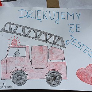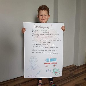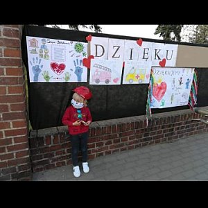 Dzieci z Przedszkola niezwykle chętnie i aktywnie włączyły się do podziękowań. Przygotowały prace plastyczne, plakaty, zrobiły fotografie z podziękowaniami. Na płocie otaczającym siedzibę przedszkola zawieszono specjalną tablicę, na której każdy może umieścić swoją pracę z podziękowaniami. Oprócz plastycznych dzieł sztuki, znaleźć można na niej także twórczość literacką. Wiersz ułożyła pani Kamila Smaga z synem Milankiem, a także pani Joanna Dacków mama Leosia.