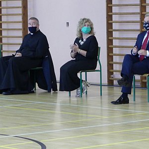 Na zakończenie krótkiej akademii Burmistrz Jerzy Wrębiak wręczył nagrody Primus Inter Pares oraz Primus za rok szkolny 2019/2020 dla najzdolniejszych uczniów i ich nauczycieli. Pamiątkowe statuetki Primus Inter Pares trafiły w ręce Alicji Czarneckiej, Nikoli Sinkowskiej, Leny Dzięgielewskiej, Julii Guszpit, Aleksandry Ożóg, Gabrieli Zachwiej, Amelii Parkoły, Natalii Lasek, Julity Mikuły i Aleksandry Krejczy oraz ich opiekunów p. Roberta Nowakowksiego i p. Dariusza Żaka, medalami Primus uhonorowani zostali natomiast Julia Bogdan, Julita Mikuła, Weronika Wikieł, Maja Bogdan, Martyna Bogdanik, Paulina Kozielec, Oliwia Kozłowska, Zuzanna Mularska, Pola Borla, Klaudia Waryga, Maria Szutkowska, Alicja Mączka, Lena Borowiec, Karolina Kuziemska, Lena Bejgier oraz trenerzy - p. Anita Golda i p. Robert Nowakowski. W krótkim programie artystycznym przygotowanym przez Samorząd Uczniowski pod opieką P. Marioli Mesjasz - Walas, p. Wioletty Perkowskiej oraz p. Łukasza Milewskiego wystąpili Kacper Górka, Alicja Mączka, Emilia Rudyk oraz Wiktoria Gajak. Oprawę muzyczną programu przygotowała p. Honorata Rodobolska, dekorację - p. Marzena Onisk, a za nagłośnienie odpowiedzialny był p. Paweł Mruklik.