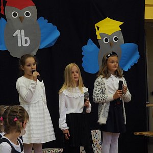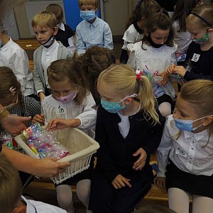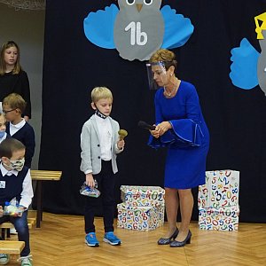 W tym ważnym dniu kilka słów do naszych milusińskich skierowała Pani Dyrektor Lucyna Bończak, która nie tylko ciepło przywitała uczniów klas pierwszych. Życzyła im także, aby czas spędzony w szkole był efektywny, pracowity, ale przede wszystkim radosny, pełen uśmiechu i przyjaźni, optymizmu i wiary w siebie. W ciepłych słowach przypomniała, że najważniejsze w procesie nauki są relacje: nie tylko z uczniami, ale i z rodzicami oraz dziadkami. To one są źródłem motywacji i efektywnej nauki. Wyraziła nadzieję, że wirus w koronie / korona wirus / nie przeszkodzi nam w tym oraz żartobliwie i optymistycznie dodała: "Zrzucamy koronę wirusowi i rozsiewamy wirusa zdrowia, życzliwości, dobroci, uśmiechu i pogody ducha".