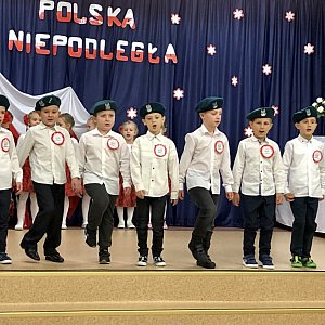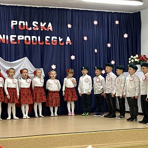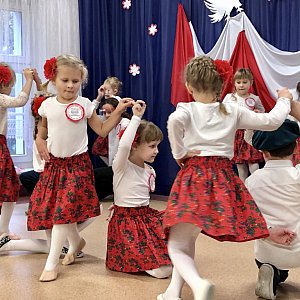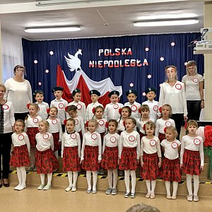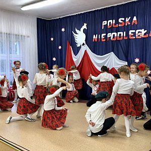 Podczas występu realizowane były treści patriotyczne, dbałość o czystość języka i poprawność polskiej mowy. W tym szczególnym dniu w salach i na korytarzach dominowały polskie symbole narodowe wykonane przez dzieci. Zwieńczeniem uroczystości było odśpiewanie hymnu o godz.11.11. W tak ważnym wydarzeniu od lat organizowanym w naszej placówce ze względu na zaistniałą sytuację nie mogli uczestniczyć jak co roku zapraszani goście i rodzice . Przedstawienie ze względów epidemiologicznych oglądały tylko dzieci z grupy "Pszczółki", jednak dzięki możliwościom nowoczesnych technologii całość została zarejestrowana w formie filmu i udostępniona zarówno rodzicom jak i pozostałym dzieciom z przedszkola.