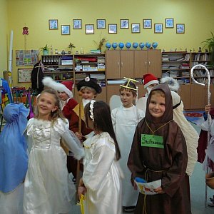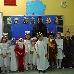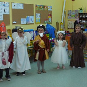 Uczniowie klas pierwszych- uczestnicy zabawy, w przepięknych i oryginalnych przebraniach prezentowali wybranych przez siebie Świętych Patronów oraz najważniejsze informacje o ich życiu. Wspólna zabawa była okazją do bliższego poznania niektórych mieszkańców nieba i zachętą do ich naśladowania. Był to także czas wspólnej integracji wszystkich Pierwszaków.