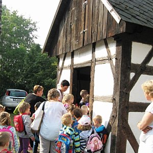 16 września z samego rana wyruszyliśmy na wycieczkę. Bez problemów, na czas dojechaliśmy do skansenu. Tam, skierowano nas do zagrody w której znajduje się piekarnia z piecem chlebowym z 1844 roku i budynki gospodarcze. Pan piekarz już na nas czekał i zaprezentował nam, jak działa taki piec.