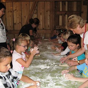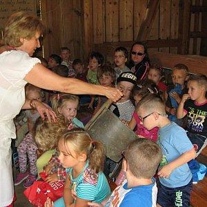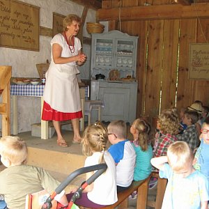 Zostaliśmy przywitani staropolskim zwyczajem chlebem i solą. Pani Gabriela Bucka, pracownik skansenu, pięknie opowiadała nam o roli chleba w życiu człowieka, zapoznała nas ze zwyczajami związanymi z wypiekiem chleba, pokazała miejsca chleba w literaturze ludowej i przysłowiach, przedstawiła sposobów mielenia zboża dawniej i dziś, zaprezentowała narzędzia używane podczas wypieku chleba. Dzieci aktywnie uczestniczyły w przygotowaniu bułeczek do wypieku w starym piecu. Elementem lekcji był poczęstunek świeżo upieczonym chlebem. (M.P)