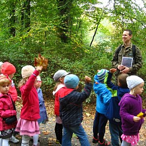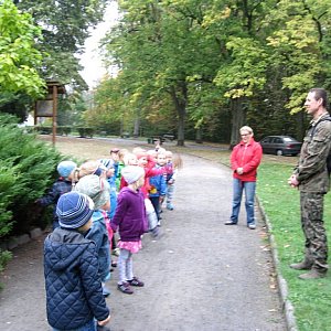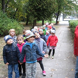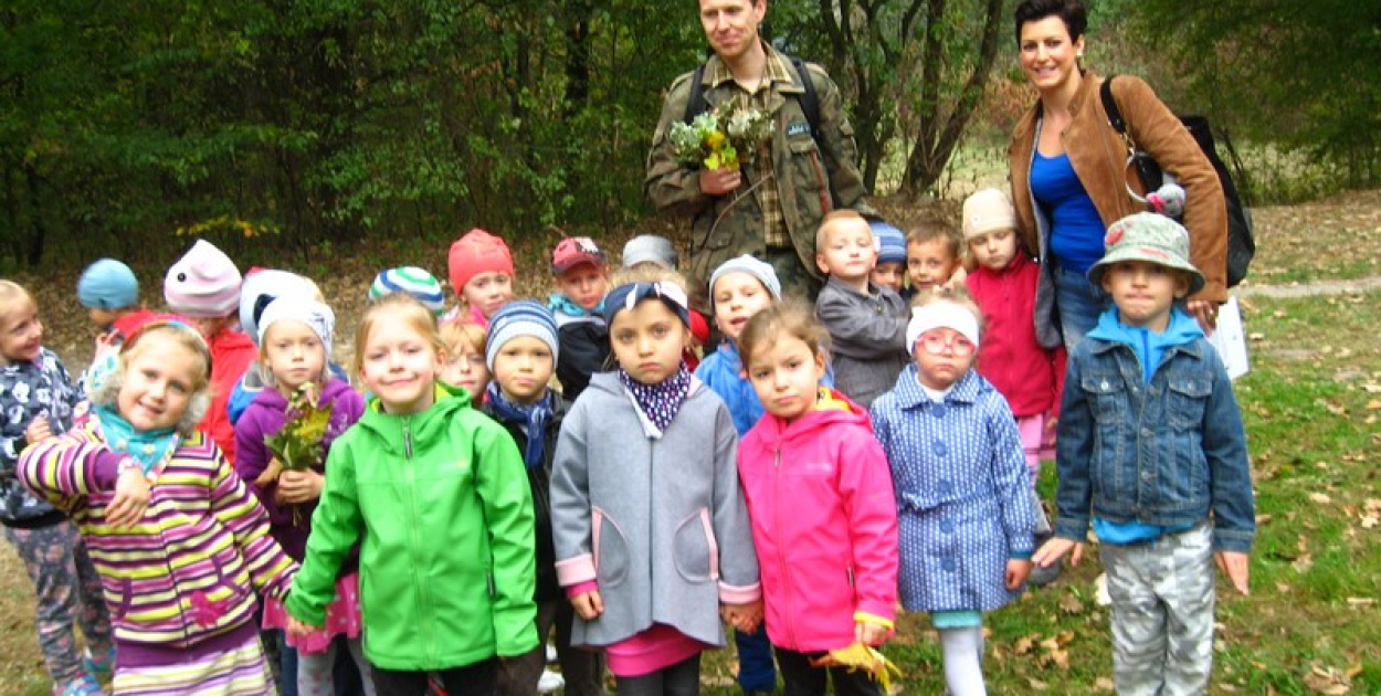 W środę 7.10.2015r. Pan Łukasz Bloch z Biura Urządzania Lasu i Geodezji Leśnej Oddział w Brzegu wraz z dziećmi z grupy III naszego przedszkola odwiedzili Park Wolności. Park ten jest ozdobą naszego miasta, można tam odpocząć, dotlenić się i na pewno miło spędzić czas. Pan Łukasz jest naszym zaprzyjaźnionym leśnikiem i tatusiem kolegi z naszej grupy. Przez całą wycieczkę był naszym przewodnikiem i instruktorem po jednym z największych parków w Brzegu. Z ogromną cierpliwością i spokojem przekazywał nam kolejne wiadomości na temat zasad obowiązujących w parku, poszanowania otaczającej nas przyrody, zmian zachodzących jesienią. Nauczyliśmy się także rozróżniać wybrane gatunki drzew na podstawie liści, owoców i zabarwienia kory np.: dąb, buk, jarzębina, jesion, klon, brzoza. Dzieci dowiedziały się także czym różni się park od lasu i po czym szybko je rozróżnić, jakie zasady należy przestrzegać, czego unikać aby być godnym użytkownikiem parku i przyjacielem przyrody. Poznaliśmy znaki i symbole obrazkowe obowiązujące na terenach zielonych, a dzieci same wyjaśniły ich znaczenie. Wychowankowie mogli pochwalić się swoją wiedzą i doświadczeniem ponieważ pan Łukasz stawiał przed nimi liczne pytania i zadania do wykonania np.: dlaczego wycina się drzewa w parku i jak określić wiek takiego ściętego drzewa. Poznaliśmy także drzewa iglaste sosnę i świerk - chociaż ciężko je spotkać mogliśmy porównać długość ich igieł w naturalnej postaci dzięki pomocom dydaktycznym, które pan Łukasz przygotował samodzielnie, specjalnie na nasze spotkanie. W przerwach pomiędzy wędrówką dzieci korzystały ze ścieżki zdrowia znajdującej się przy jednej z dróżek, śpiewały piosenki i oczywiście zbierały liście i żołędzie. Najwięcej radości sprawiło dzieciom zadawanie pytań dla naszego przewodnika, chwalenie się zebranymi skarbami oraz swobodna zabawa na górce. Zdarzyło się oczywiście, że przedszkolaki troszkę przeszkadzały i były niesforne, ale otrzymały naprawdę dużą dawkę wiedzy, bodźców i pozytywnych wrażeń jak na pięciolatki przystało i to podczas jednego spaceru po parku. Na koniec spotkania wszystkie dzieci dostały kolorowe karty pracy z wykazem drzew rosnących w parku oraz zasad w nim obowiązujących. Bardzo dziękujemy za tak wyczerpującą lekcję przyrody i serdeczne przyjęcie naszej grupy, przepraszamy za małe wybryki, mamy nadzieję, że jeszcze spotkamy się na zajęciach w terenie lub w sali przedszkolnej. Pozdrawiamy i dziękujemy za współpracę dla całego Biura Urządzania Lasu i Geodezji Leśnej Oddział w Brzegu!