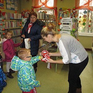 W obchody Święta Niepodległości bardzo aktywnie włączyli się również rodzice, którzy dostali do wykonania misję specjalną - wykonanie ze swoimi pociechami kotylionów. Ilość kotylionów bardzo mile nas zaskoczyła, a słowa rodziców wzruszonych taką akcją, dodawały skrzydeł. W tym roku postanowiliśmy świętować trochę inaczej niż dotychczas, więc kolejnym etapem Dnia Niepodległości był happening z kotylionami. Poszczególne grupy wyruszyły do Urzędu Miasta, Biblioteki Miejskiej, Zespołu Szkół nr 1 z Oddziałami Sportowymi oraz na ulice naszego miasta, wręczając jego mieszkańcom wykonane wcześniej z rodzicami kotyliony. Reakcje mieszkańców bardzo nas ucieszyły, spotykaliśmy się z wieloma gestami wzruszenia, miłymi słowami podziękowania. Dzięki pomysłowej i zaangażowanej kadrze "Dziesiątki" wspólne świętowanie Dnia Niepodległości było w tym roku pełne radości, wzruszeń i aktywności.