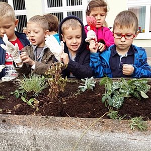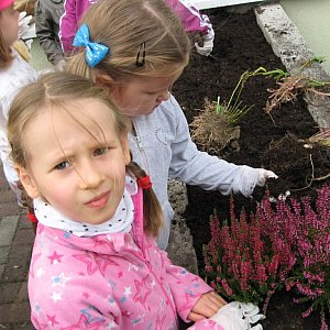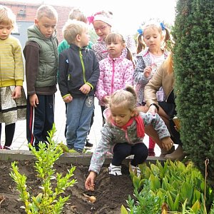 Jesienią 2014 dzieci z sadziły rośliny cebulowe (tulipany, żonkile, hiacynty i krokusy) na przedszkolnej rabacie. Wiosną mogliśmy podziwiać piękne, kolorowe kwiaty. W tym roku, na początku października na rabacie, a także w donicach na tarasie posadziliśmy byliny i rośliny wieloletnie, które zakwitną latem i będą kwitły do późnej jesieni. Nasz klomb wzbogacił się o cebule hiacyntów, tulipanów, krokusów, narcyzów, sadzonki hortensji, sasanek, traw ozdobnych, goździków, wrzosów, a nawet truskawek.