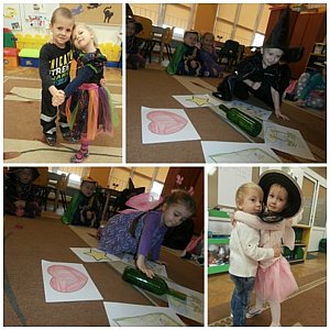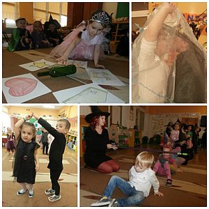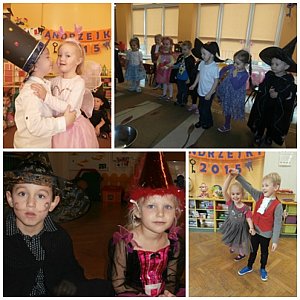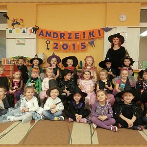 Na początku mieliśmy problem z magiczną księgą, ponieważ okazało się, że można ją otworzyć jedynie za pomocą magicznego zaklęcia połączonego z pięknym tańcem. Następnie odbył się pokaz andrzejkowej mody, po czym stworzyliśmy wielką pajęczynę przyjaźni. Nasi czarodzieje po zatańczeniu kociego tańca udali się do studni marzeń, gdzie trzeba było pomyśleć życzenie, a następnie chuchnąć na monetę i wrzucić ją do metalowej miski. Kolejno odbył się taniec zarówno "z" jak i "pod" miotłą oraz następne wróżby m. in. ekscytujący wyścig butów. Na koniec otrzymaliśmy informację, iż Św. Mikołaj zostanie uwolniony, ponieważ wspaniale poradziliśmy sobie ze wszystkim zadaniami. Całą zabawę zakończyliśmy wspólnym tańcem do piosenki "Kochajcie czarownice".