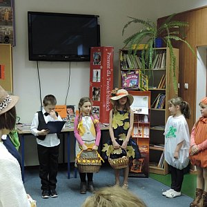 Czekały na nich następujące niespodzianki: przedstawienie teatralne, wystawa książek zakupionych z projektu "Książki naszych marzeń", prelekcja na temat wartości czytania oraz "Lekcje dla rodziców" ze skarbów mądrości książkowych. Uczniowie klas IIa, IId, IIIa i Vc oraz gościnnie uczennica klasy IIIa PSP nr 5 przygotowali inscenizacje wierszy "Na straganie" Jana Brzechwy, "Jesień" Doroty Strzemińskiej-Więckowiak oraz utworu Marii Terlikowskiej "Idzie jesień". Młodzi aktorzy i aktorki występujący w przedstawieniu to uczestnicy warsztatów teatralno-filmowych prowadzonych przez panią M.Lenard. Wzorowo zaprezentowali się: narrator - Filip Klimko z klasy IId, jesień - Lena Lenard z klasy IIIa, gosposia - Klaudia Waryga z klasy IId, szczypiorek - Szymon Żuratyński z klasy IIa, koper - Julia Nakonieczna z klasy IIId, groch - Julia Rybacka z klasy Vc, rzepa - Angela Kibanda z klasy IId, pietruszka - Julka Konarska z klasy IIIa, seler - Amelka Grabowska z klasy IId, cebulka - Ala Mączka z klasy IIIa, burak - Alex Lasek z klasy IIa, fasolka - Malwina Kramek z klasy IIId, brukselka - Amelka Siedlecka z klasy IIIa, marchewka - Dominika Rybarczyk z klasy IId, kapusta - Maja Zielińska z klasy IId.
