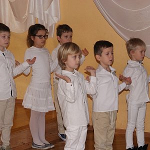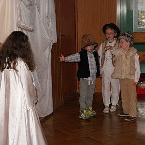 Wszystkie sceny przedstawiające wydarzenia związane z Bożym Narodzeniem dzieci odegrały, posługując się wyłącznie gestem, mimiką i wyćwiczonymi ruchami ciała, z wykorzystaniem elementów tanecznych. Na tle podkładów muzycznych sześciolatki przepięknie wykonały kolędy w języku migowym. Co ciekawe, w trakcie prób poprzedzających występ dzieci nie tylko odtwarzały ujęte w scenariuszu elementy ruchu, ale także współtworzyły dodatkowe gesty, by jeszcze bardziej przekonująco zaprezentować osobowość i charakter postaci, którą miały wykreować. To wielkie zaangażowanie uczniów stało się źródłem satysfakcji nie tylko ich samych, ale również realizujących projekt nauczycieli. Kolędy, lekcje języka migowego dla przedszkolaków przygotowała pani Anna Nowacka, a autorką scenariusza i scenografii do przedstawienia była pani Mariola Mesjasz. Niezwykłą inscenizację jasełek obejrzeli: pani dyrektor - Jadwiga Walasek, pani wicedyrektor - Ewa Stefanowicz, rówieśnicy młodych aktorów - uczniowie klas pierwszych, rodzice uczniów klasy 1B, a także dzieci z Publicznego Przedszkola nr 10. Na zaproszonych przedszkolaków czekała kolejna niespodzianka - lekcja w języku migowym, podczas której po raz pierwszy uczyły się komunikować poprzez znaki manualne, mimiczne oraz ruchy wykonywane głową i tułowiem. Rodzice mogli obejrzeć spektakl w specjalnie na tę okazję zainscenizowanej kawiarence, w której przy blasku świec zasiedli przy przykrytych kolorowymi obrusami stołach z kawą, herbatą, ciastkami i cukierkami. Warto też wspomnieć o skrupulatnie dobranych rekwizytach, które przecież w przedstawieniu bez słów odgrywają rolę tak istotną. Wystrój pomieszczenia, scenografia, rekwizyty, tematyka inscenizacji wprowadziły zebranych w niepowtarzalny klimat Bożego Narodzenia. To były niepowtarzalne jasełka bez słów.