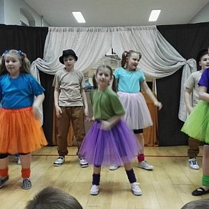Teraz na scenie ukazali się uczniowie klas trzecich, którzy dla swoich młodszych kolegów śpiewali, tańczyli i recytowali wiersze, po czym do zabawy zaprosili samych gości. Po wesołych pląsach i wykazaniu się sprawnością fizyczną przyszedł czas na zwiedzanie szkoły. A tam w każdej klasie inna niespodzianka!