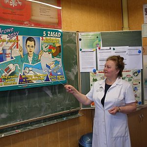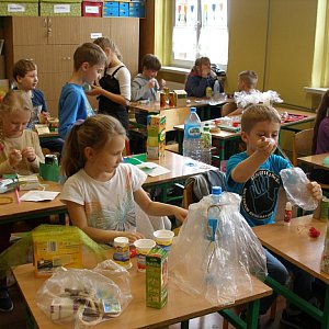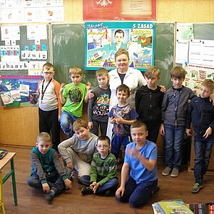 Odwiedziły nas panie z Sanepidu, które przypominał, jak dbać o higienę ciała i ubrań. Nasza szkolna pani pielęgniarka tłumaczyła nam, jak ważne jest codzienne szczotkowanie zębów i systematyczne wizyty kontrolne u stomatologa. Próchnicy zębów stanowczo mówimy "NIE!". O zdrowym odżywianiu rozmawialiśmy z nasza panią podczas Dnia Bez Słodyczy i Dnia Marchewki. Przyszliśmy do szkoły ubrani na pomarańczowo, z naszych bluzek uśmiechały się papierowe marchewki, Jula i Weronika nosiły na głowach marchewkowe korony, a warkocz Zuzi splatała urocza frotka - marchewka. Przez cały dzień chrupaliśmy soczyste marchewki i piliśmy sok marchewkowy. W piątek dużo czasu poświęciliśmy naszej planecie, obchodząc Światowy Dzień Ziemi. Pani czytała nam bajki o tematyce ekologicznej i zastanawialiśmy się, co my - dzieci możemy uczynić, aby nasza Ziemia była czysta i "uśmiechnięta". Poznaliśmy nowe słowo "recykling" i ucząc się zasad segregacji śmieci, wykonaliśmy urocze Śmieciowe Potwory. Uwieńczeniem tygodnia był bardzo emocjonujący próbny alarm przeciwpożarowy i ewakuacja szklona. Mimo tego, iż nasza pani tłumaczyła nam zasady zachowania się podczas ewentualnego pożaru i doskonale wiedzieliśmy, że głośny dźwięk dzwonka jest sygnałem do rozpoczęcia ćwiczeń ewakuacji, dwie nasze koleżanki przerosły troszkę emocje i na twarzy pojawiło się kilka łez. Uff, już po wszystkim!