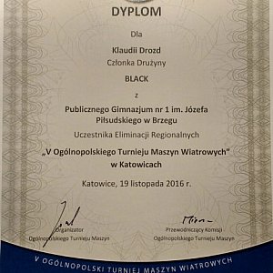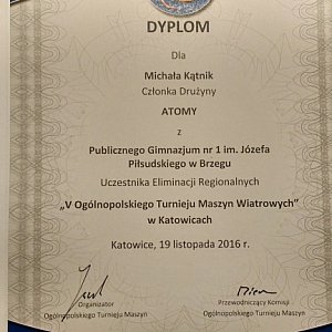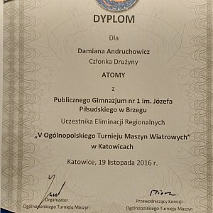19.11.2016 r. w Katowicach odbył się etap regionalny V Ogólnopolskiego Turnieju Maszyn Wiatrowych, na którym Publiczne Gimnazjum nr 1 w Brzegu reprezentowali: Klaudia Drozd (kl. II A) i Damian Andruchowicz i Michał Kątnik (kl. II B).
