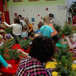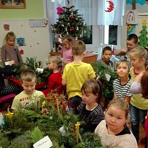 Przedszkolaki swą pracę rozpoczęły od wbijania gałązek świerkowych w gąbkę florystyczną lub doniczkę z ziemią, co przychodziło im z ogromną łatwością mimo, że igiełki kuły rączki dzieci. Po ciężkiej pracy przyszedł czas na przyjemniejszą część, a mianowicie - ozdabianie stroików. Dzieci ozdabiały je koralikami, perełkami, cekinami, brokatem, kolorowymi, błyszczącymi bombkami, świecidełkami oraz lśniącymi łańcuchami. W swą pracę włożyły całe serce.