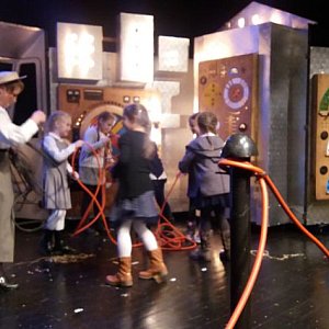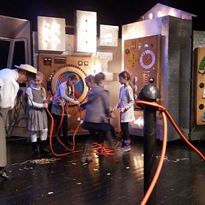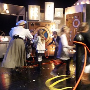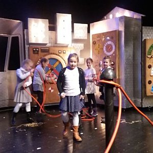 Aktorzy nawiązali kontakt z publicznością i dosłownie wciągnęli nas w historię Tesli. Dosłownie, ponieważ niektórzy z nas na kilka chwil stali się aktorami, jak na przykład Nina, która miała wypróbować działanie dynama rowerowego, czy też Kasia, Madzia, Hania, Stefcia, Agatka, Amelka i Martynka, które zostały na kilka chwil asystentkami Tesli.