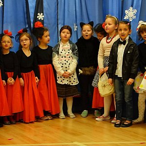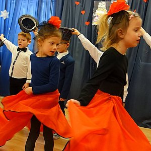 Mali aktorzy świetnie oddali wszystkie emocje targające młodą parą. Następnie po słowach A. Rosiewicza "Czterdzieści lat minęło, jak jeden dzień" przenieśliśmy się w przyszłość, oglądając zabawną scenkę z życia sędziwych dziadków. Taniec to ulubiona aktywność artystyczna Naszych przedszkolaków, dlatego też wytańczyliśmy twista oraz tango. Wielokrotnie na sali wybuchały salwy śmiechu, ale również pojawiło się wiele łez wzruszenia i dumy.