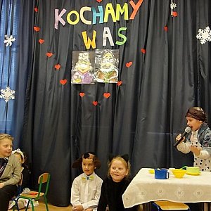Najstarsza grupa KUBUSIE z Przedszkola Publicznego nr 1 z okazji dnia BABCI I DZIADKA postanowiła w swoim programie pokazać jak poznała się babcia z dziadkiem oraz jak potoczyło się ich życie dalej... Cofnęliśmy się do początków ich miłości, pierwszych rozterek i radości, kłótni i szczęścia. Mali aktorzy świetnie oddali wszystkie emocje targające młodą parą. Następnie po słowach A. Rosiewicza "Czterdzieści lat minęło, jak jeden dzień" przenieśliśmy się w przyszłość, oglądając zabawną scenkę z życia sędziwych dziadków.