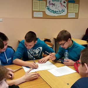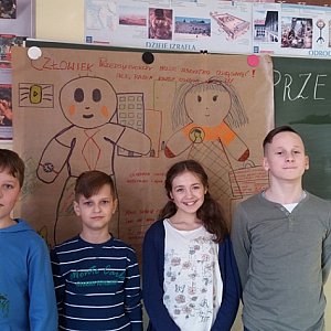 Zaowocowało to dobrze rozwiązanymi testami po zajęciach. W niektórych klasach tworzono sylwetki ludzi przedsiębiorczych. Wykonanie tych prac wymagało od młodzieży zorganizowania się w grupy, przydzielenia sobie zadań, postawienie celów, pilnowanie czasu wykonania i oczywiście omówienie efektów swojej pracy. Takie działania to przecież nic innego jak próba przedsiębiorczości. Od razu było widać, które osoby są liderami, kto ciężko pracuje, a kto korzysta z efektów pracy całej grupy niewiele do niej wnosząc. Tym pracom przyglądali się goście, którzy odwiedzili naszą szkołę, pan kurator - Michał Siek, pani dyrektor do spraw organizacji pragmatyki zawodowej nauczycieli - Zofia Sochacka oraz jej zastępca pan Piotr Łaba. Podobały im się efekty pracy młodych przedsiębiorców, ich sposób pracy, a także jakość orgaznizowanych zajęć. Gimnazjaliści wzięli ponadto udział w teście na temat przedsiębiorczości i omówieniu go przez specjalistę w tej dziedzinie. Wszyscy uczniowie podsumowali ten dzień jako barwny i ciekawy. Wielu z nich potwierdziło, że dobrze się bawili i wiele nauczyli. Oby tak było. Młodzi ludzie zyskali świadomość, że aby osiągnąć sukces potrzeba mieć cel i niebanalny pomysł, uparcie dążyć do jego realizacji i ciężko pracować.