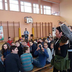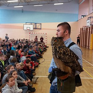 Jednak największą radość dzieci miały z faktu, iż ptaki przelatywały tuż nad ich głowami. Opiekunowie stali po dwóch stronach sali i przywoływali swoich podopiecznych. Za prawidłową reakcję ptaszysko otrzymywało nagrodę w postaci surowego mięsa. Wywołano też na środek kilku uczniów i nauczycieli. Jastrząb przelatywał przez obręcze utworzone z ich rąk i robił to bezbłędnie. Zwieńczeniem tych zajęć była możliwość zrobienia zdjęcia z sową. Chętnych było wielu.