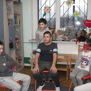 Świetlicę odwiedzili wyjątkowi goście - muzyk p. Daria Maryszczak oraz lekarz p. Damian Bloch. Dziaciaki miały okazję zagrać kilka nutek na profesjonalnym flecie i wysłuchać "koncertu" w wykonaniu pani Darii. Pan doktor rozmawiał z podopiecznymi świetlicy na temat zdrowego stylu życia i zasad udzielania pierwszej pomocy. Dużo śmiechu wywołało bandażowanie kończyn "rannych" kolegów. Szczególną atrakcją były zajęcia prowadzone przez instruktora zumby p. Jolantę Mularską.