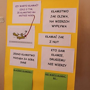 Oczywiście najlepsza była zabawa w wykrywanie kłamstw i chociaż niektóre zdania sprawiły odrobinę trudności dzielni trzecioklasiści dali radę! Nie warto kłamać, bo "kłamstwo ma krótkie nogi" i wychodzi na jaw wcześniej czy później, także wtedy gdy absolutnie się tego nie spodziewamy. Zajęcia przygotowała i prowadziła pani Elżbieta Skrzypczyńska.