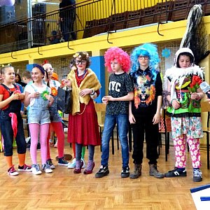 Całość zabawy została brawurowo poprowadzona przez uczennice klasy 5 b - Kornelię Sachaj i Alicję Wiącek . Oczekiwanie na werdykt jury umilił uczestnikom występ kółka wokalnego, przygotowanego pod kierunkiem p. Katarzyny Głuskiej, w utworach "Tyle słońca w całym mieście" oraz "Pomaluj mój świat". Największą jednak niespodzianką było niesamowite "Starcie Gigantów". Spotkały się w nim dwie, pięcioosobowe, drużyny, reprezentujące uczniów i nauczycieli. Obie równie mocno dopingowane i zachęcane do rywalizacji. Kalambury, przyszywanie guzików czy obieranie ziemniaka na czas, quiz z wiedzy ogólnej, bieg z piłeczką na łyżce - budziły ogromne emocje. Okazało się, że zarówno nauczyciele, jak i uczniowie, nie tylko świetnie się bawią, ale są tak samo mocno zmotywowani by odnieść zwycięstwo. Zabawy i śmiechu było co niemiara. Na końcu rozgrywek wszyscy jednak zgodnie uznali, że to wcale nie wygrana jest najważniejsza, ale wspólnie miło spędzony czas Pozostaje nam mieć nadzieję, że w tym roku to właśnie uczniowskie radość i uśmiech na dobre przegoniły już zimę, nawet bez topienia Marzanny ;)
