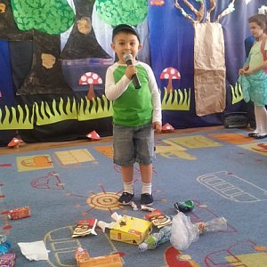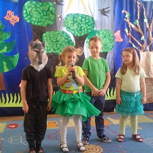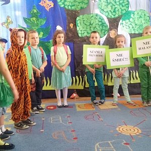Pomagały również w przygotowaniu dekoracji do przedstawienia. Na zajęciach wykonały piękne zielone drzewa, którymi udekorowano las w przedstawieniu "Mali strażnicy przyrody". W tym dniu dominującym kolorem w przedszkolu był kolor zielony. Dzieci poprzez przedstawienie ukazały, jak należy dbać o nasze środowisko przyrodnicze oraz pokazały również złe działania człowieka, które doprowadzają do niszczenia przyrody. Po zakończonych występach dzieci zostały nagrodzone wielkimi brawami oraz słodkimi niespodziankami. Piekarnia "Barbara" w Olszance ufundowała dzieciom przepyszne pączki, a pozostali goście przekazali małym aktorom cukierki oraz gratulacje i podziękowania za wspaniały występ. Na zakończenie spotkania dzieci wręczyły rodzicom i zaproszonym gościom zielone koniczynki jako symbol czystej zielonej Ziemi.
