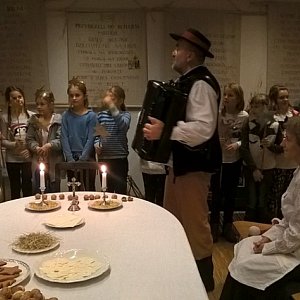 Spotkanie przeplatane było wspólnym śpiewaniem kolęd. Zebrani wokół wigilijnego stołu śpiewaliśmy znane nie tylko na Śląsku kolędy: "Pójdźmy wszyscy do stajenki", "Przybieżeli do Betlejem", "Lulajże Jezuniu", " Do szopy", "Dzisiaj w Betlejem" i "Cicha noc". Siedząc w blasku choinkowych światełek i płonących świec, poczuliśmy prawdziwie świąteczny klimat, a dzieci zgodnie przyznały, że wycieczka do Bierkowic to wspaniały prezent mikołajkowy.