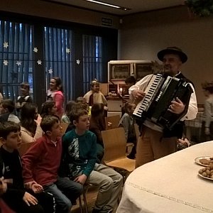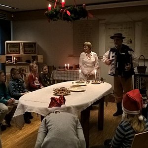 Tym razem zaproszono nas do jednej z sal imitującej tradycyjną śląską izbę. Celem naszej wizyty było poznanie zwyczajów i obrzędów związanych z obchodzeniem Świąt Bożego Narodzenia na Śląsku Opolskim. Przywitali nas ubrani w regionalne stroje - pan Adam i pani Gabriela. Gospodarze, wspaniali gawędziarze, interesująco i barwnie opowiadali o dawnych obrzędach i zwyczajach andrzejkowych, adwentowych i bożonarodzeniowych. Dzieci miały możliwość uczestniczyć w zaimprowizowanym korowodzie kolędników.